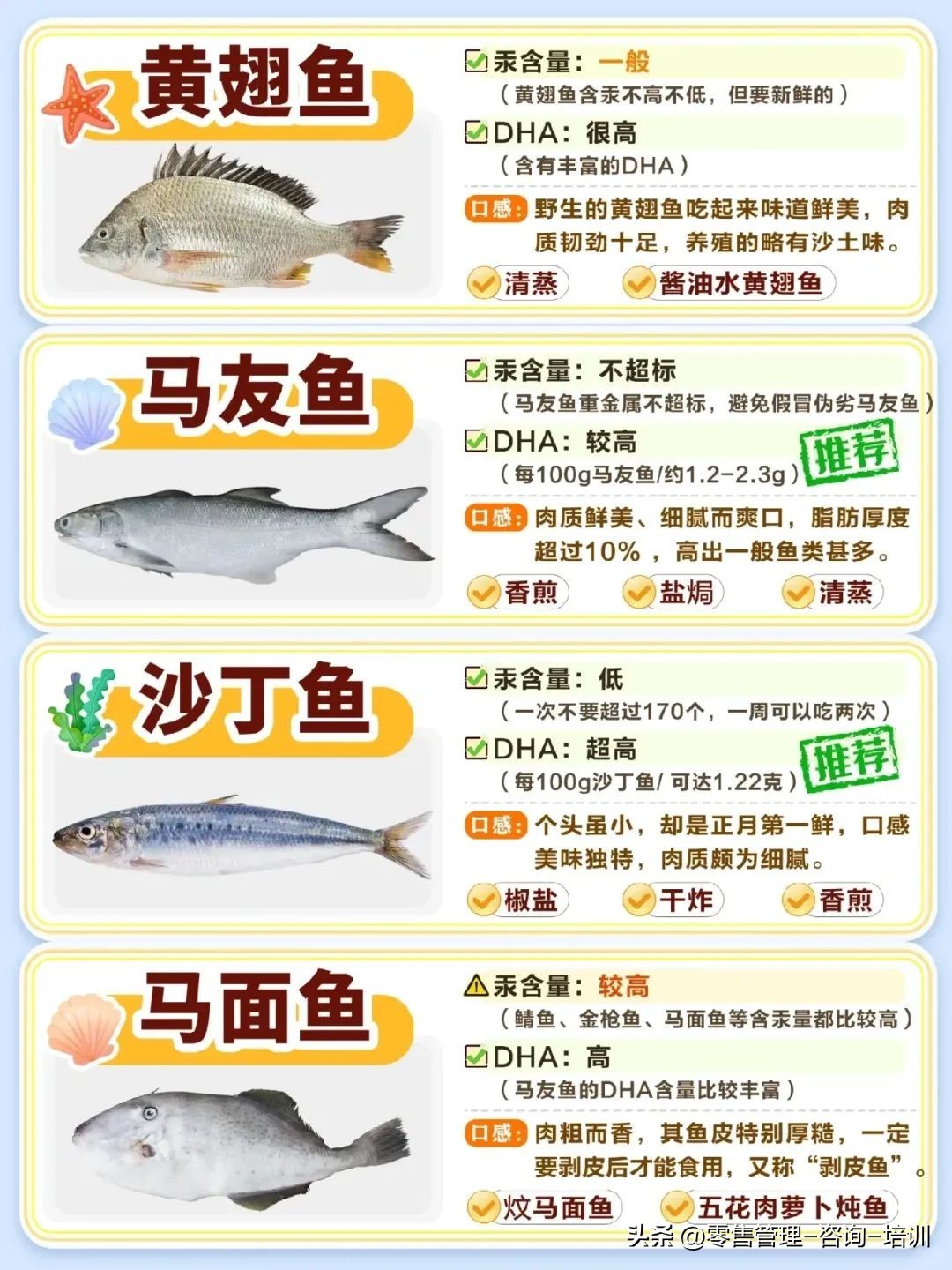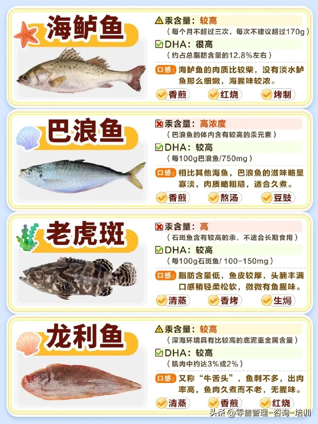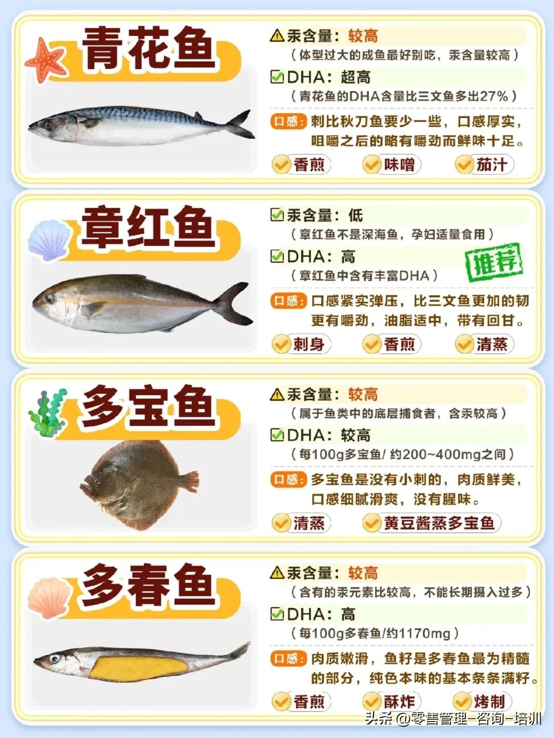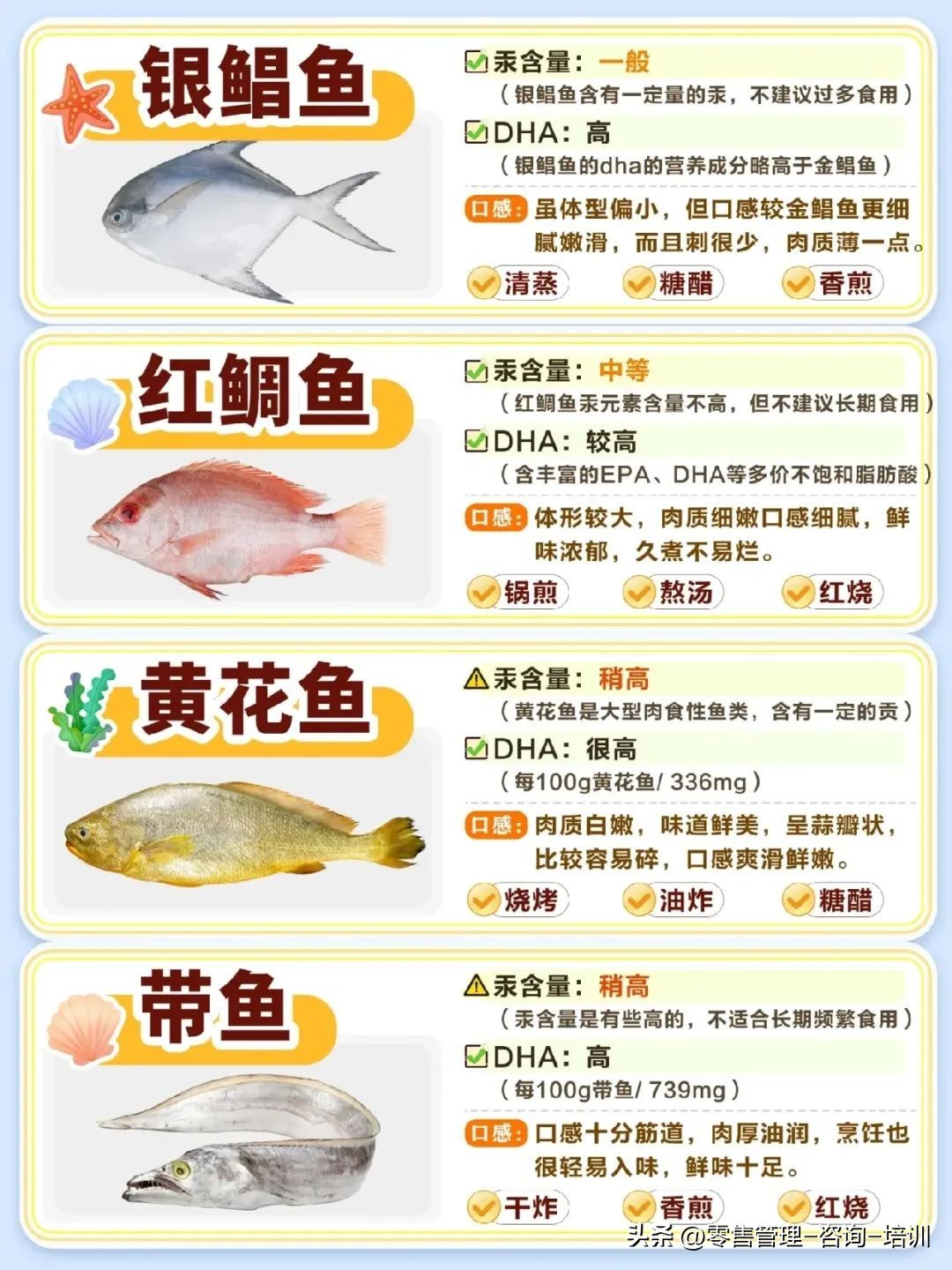 鳕鱼、金鲳鱼、三文鱼、金枪鱼、海鲈鱼、老虎斑、龙利鱼、银鲳鱼、黄花鱼等都在图片里面了介绍了。