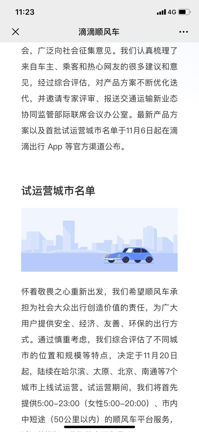 方案提到,试运营期间,将在哈尔滨、北京等7个城市首先提供5:00-23:00(女性5:00-20:00)、市内中短途(50公里以内)的顺风车平台服务,试运营期间不收取信息服务费。