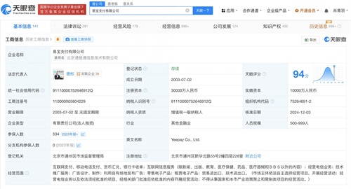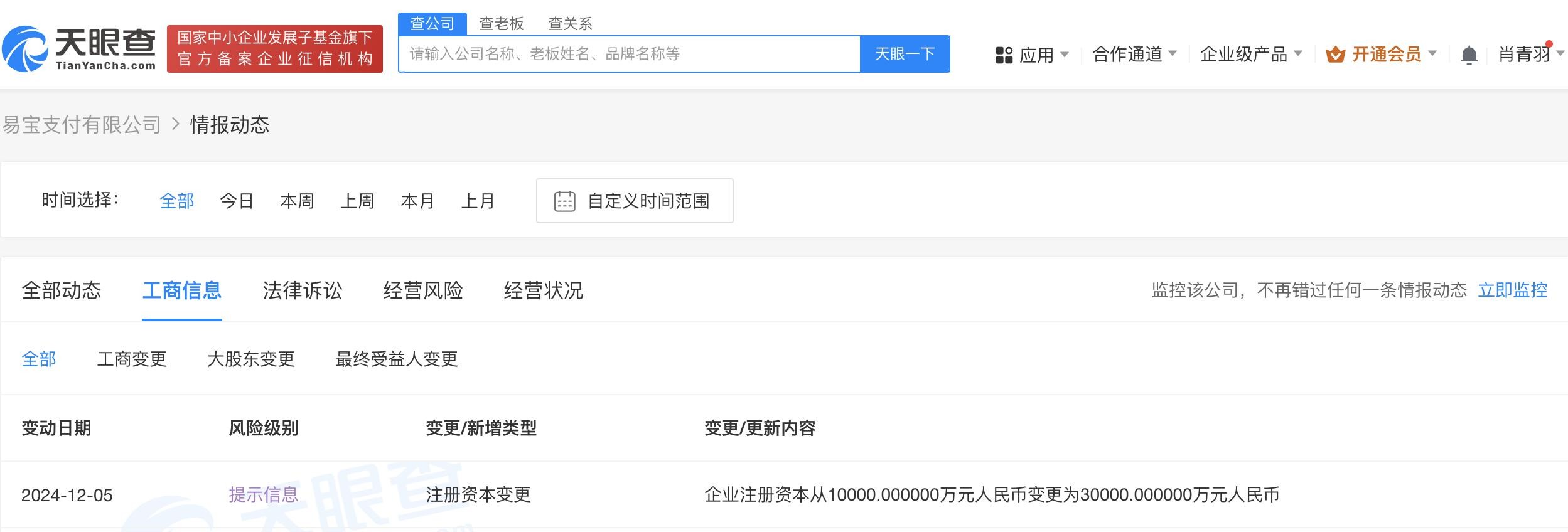 每经AI快讯,天眼查App显示,近日,易宝支付有限公司发生工商变更,注册资本由1亿元人民币增至3亿元人民币,增幅200%。