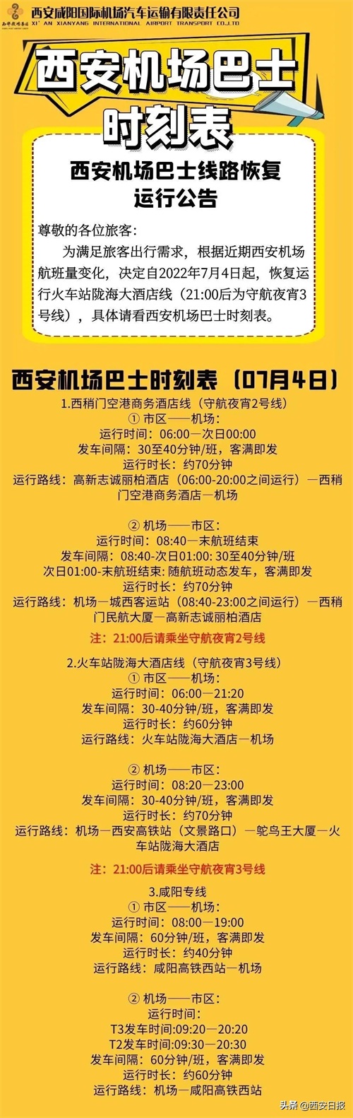 为满足旅客出行需求,根据近期西安机场航班量变化,自2022年7月4日起恢复运行火车站陇海大酒店线(21:00后为守航夜宵3号线),具体可戳下图: