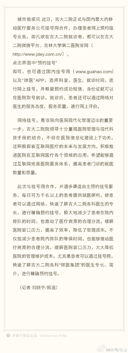 吉大二院正式与挂号网合作,办理患者网上预约挂号业务。即凡欲在吉大二院就诊者,都可以在吉大二院微信平台、吉林大学第二医院官网,点击界面中“预约挂号”即可,也可通过国内挂号网以及“微医”APP,选择科室、医生、就诊时间,进行网上挂号,并根据预约成功短信、身份证就可以在医院取号就诊。就诊后,患者还可以通过网络对医生的服务态度、服务质量,进行网上评价。