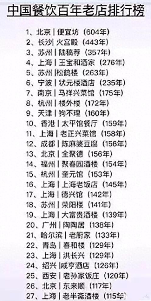 排第一的是北京便宜坊烤鸭店(604年),第二长沙火宫殿(443年),第三苏州陆稿荐(357年)……