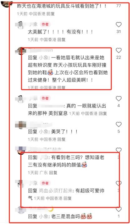 评论区有网友追问张柏芝三仔颜值,“有看到老三吗?想知道老三有没有继承妈妈的颜值”。