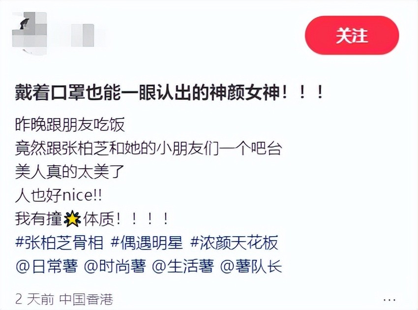这位美女在社交平台晒出自己和张柏芝的合照,大赞对方是“戴着口罩也能一眼认出的神颜女神!”并透露在尖沙咀一间餐厅见到张柏芝的经过:“昨晚跟朋友吃饭,竟然跟张柏芝和她的小朋友们一个吧台,美人真的太美了,人也好nice!!”