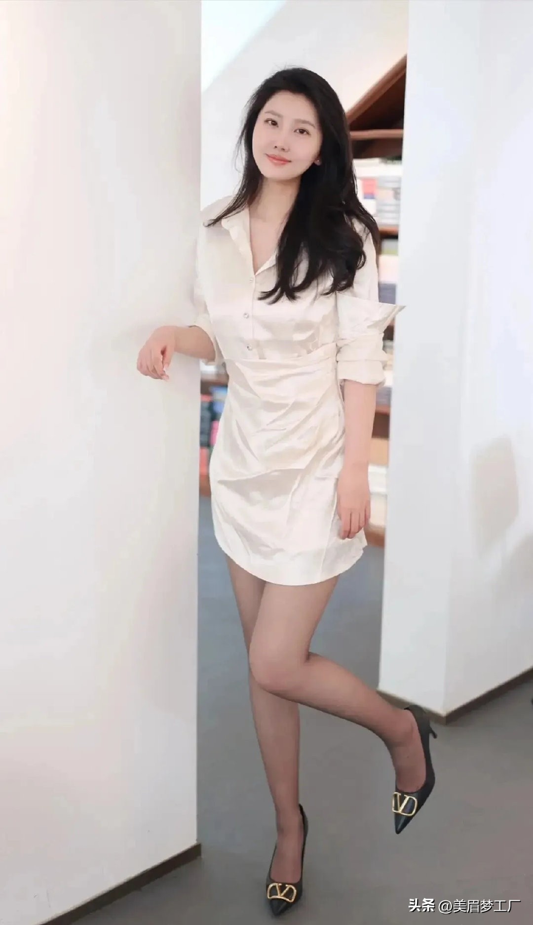 她的这件白色连衣裙设计得恰到好处,既简洁大方又不失女性特有的柔美。裙摆随风轻轻飘动,仿佛一朵盛开的白莲,在喧嚣的都市中显得格外清新脱俗。裙子的长度恰到好处地展露出她的纤细美腿,既不失端庄,又带着一丝小性感,让人忍不住多看几眼。