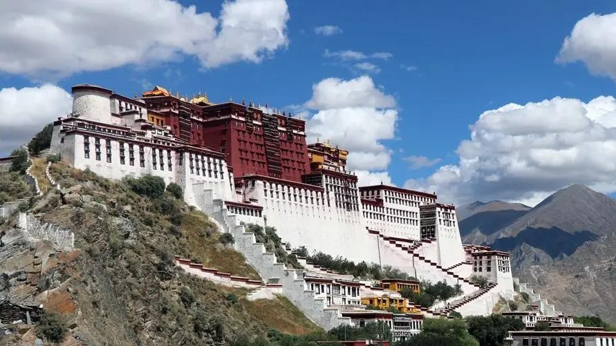 西藏拉萨-布达拉宫:西藏的代表,一座规模宏大的城堡式建筑群,屹立在拉萨市区西北的红山上,整座宫殿为典型的藏式建筑风格,依山而建,气势雄伟,宫殿正门前的布达拉宫广场成为著名的拍照纪念地。