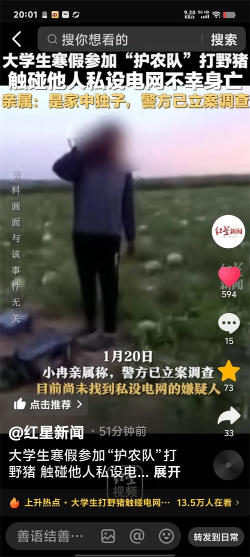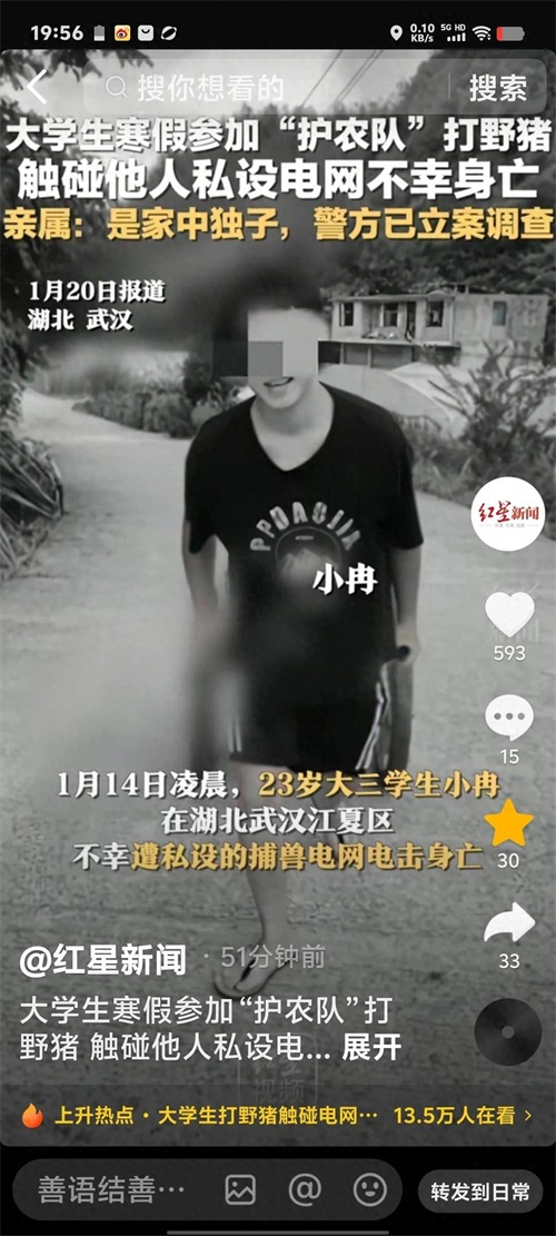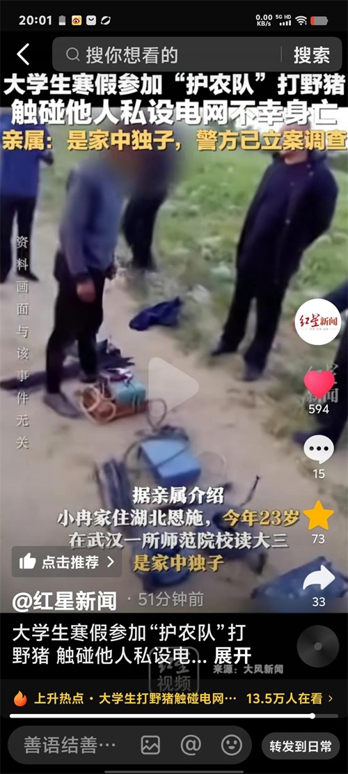 寒假里,一个23岁的大学生,生命戛然而止。他叫小冉,是武汉一个师范专业的大三学生,家里的独苗。你说,这得多让人心痛? 他参加了一个什么“护龙队”,上山打野猪,结果触碰到私设的电网,没了。