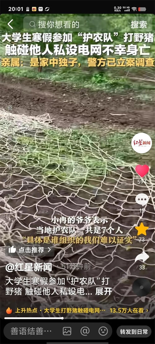 这不仅仅是一起意外,更是一起人祸! 这几年,野猪伤人事件频发,可这也不能成为私设电网的理由。咱们应该找到更安全、更有效的方法来解决问题,而不是拿人命去冒险。那些躲在暗处,图方便,不顾他人安危的人,必须受到严惩!
