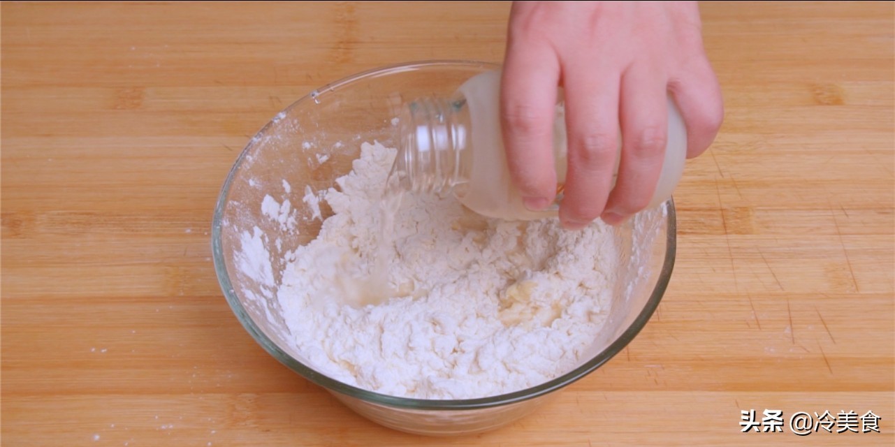 3:先用筷子把鸡蛋和面粉充分搅拌均匀,再少量多次地加入大约100毫升的温水。
