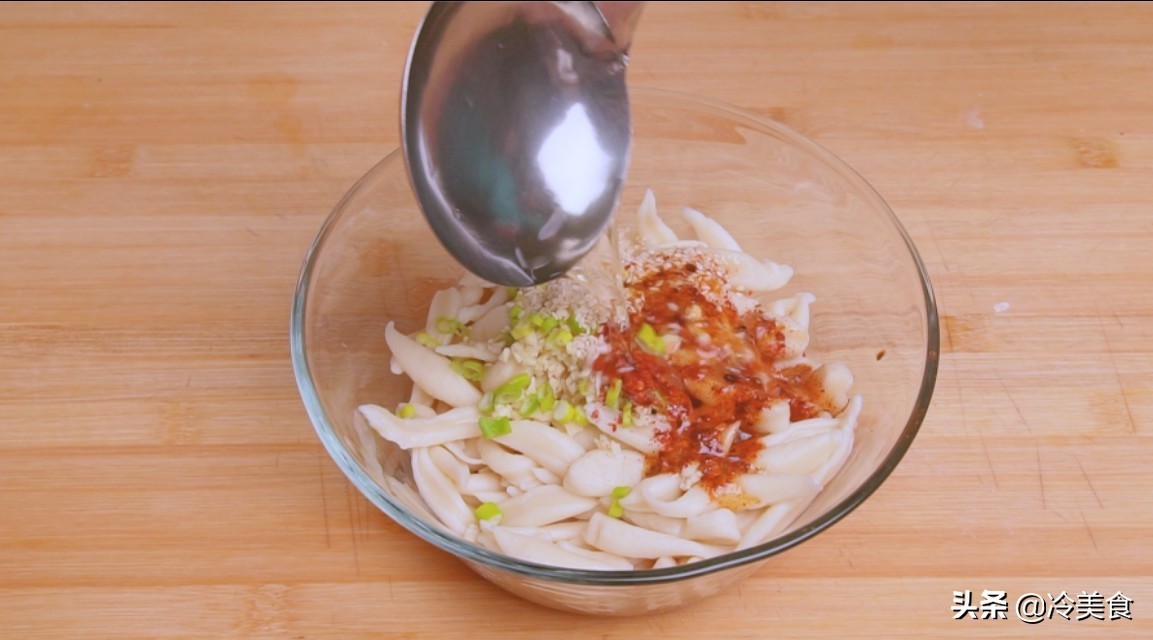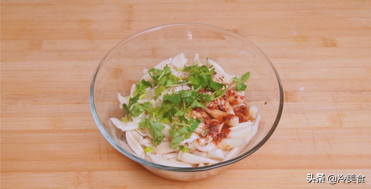 9:然后把它们再放入到一个干净的大碗里面,加入半勺盐,一勺白糖,一勺香醋,一勺生抽,再加入少许蒜末、葱花。一勺辣椒粉,一勺熟芝麻,再淋入一勺滚烫的热油激发出它们的香味。