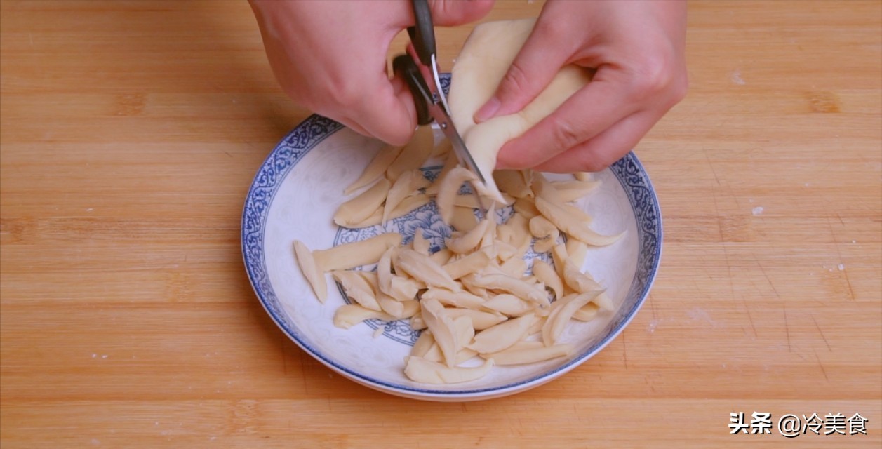 6:接着我们用剪刀把面团剪成面鱼的形状。