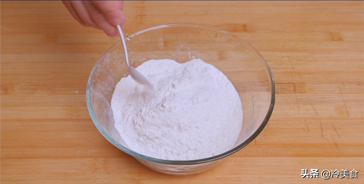 1:首先我们准备300克的面粉,加入2克盐增加面粉的筋性,然后用筷子先把它们充分的搅拌均匀。