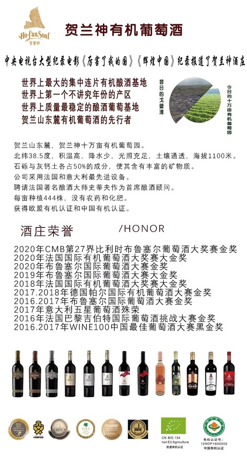 贺兰神国际葡萄酒庄位于中国宁夏贺兰山东麓葡萄酒核心产区,拥有十万亩有机葡萄产业园和领先的葡萄酒生产工艺和种植灌溉技术,短短几年中在国际葡萄酒赛事上获得了众多大奖,已成为了国内高品质葡萄酒的典范。
