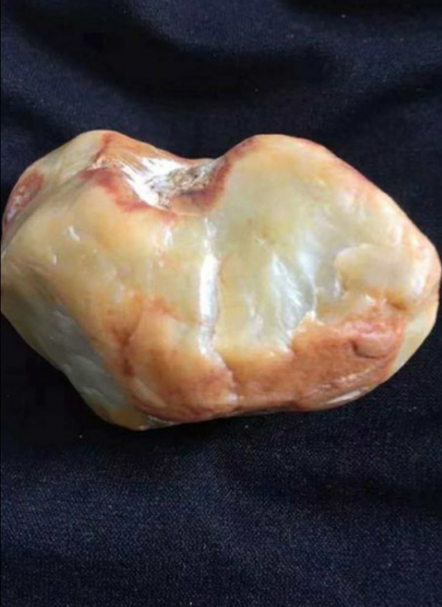 特点:块度比较小,一般为卵石形状,表面很光滑圆润,带皮色(玉料的疏松部分或绺裂处受到矿物的侵入形成的颜色)。