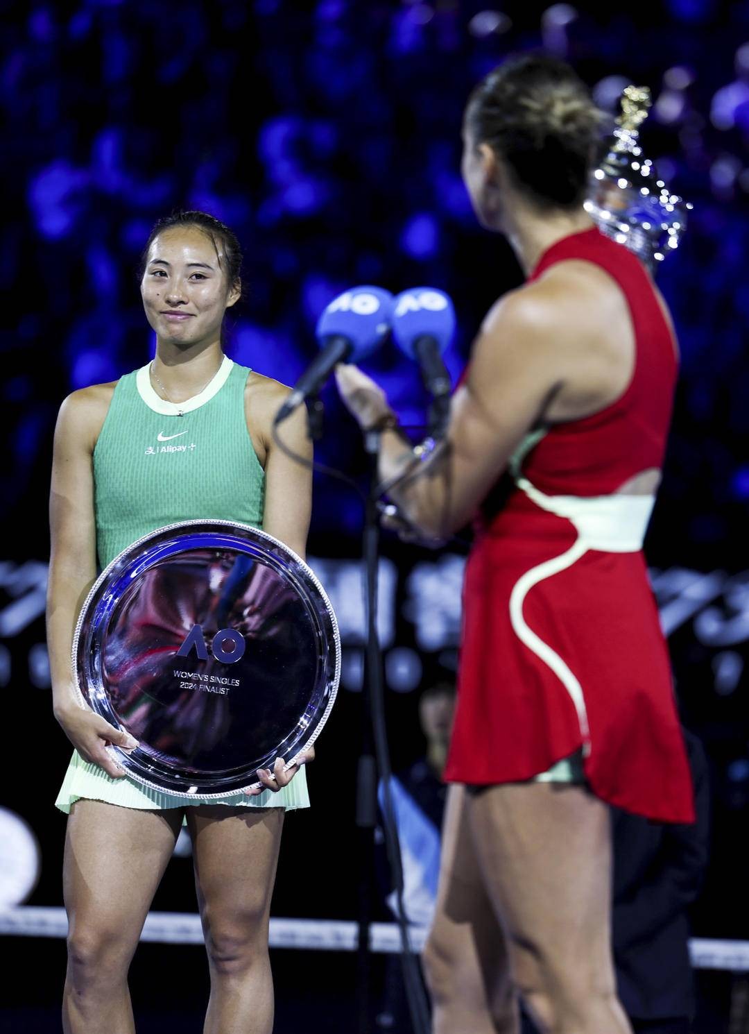 郑钦文(左)在2024澳网女单颁奖典礼上。