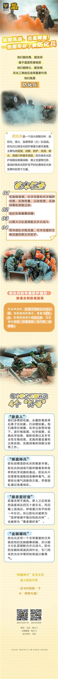 又是一年征兵季,你准备好了吗?国防在线【迷彩小课堂】系列图解,带你了解关于陆军、海军、空军和火箭军等不同军兵种的“那些事儿”,立志参军的你,不妨来跟我们看看你心心念念想要成为的“他(她)”。本期我们来带你了解一下防化兵!“降魔神兵”,英勇无畏,你是否想加入呢?