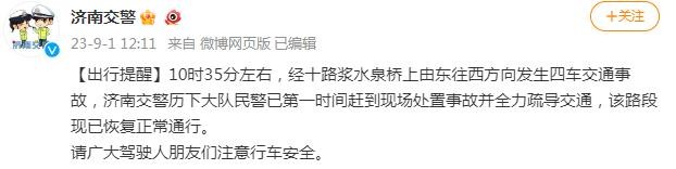 10时35分左右,经十路浆水泉桥上由东往西方向发生四车交通事故,济南交警历下大队民警已第一时间赶到现场处置事故并全力疏导交通,该路段现已恢复正常通行。