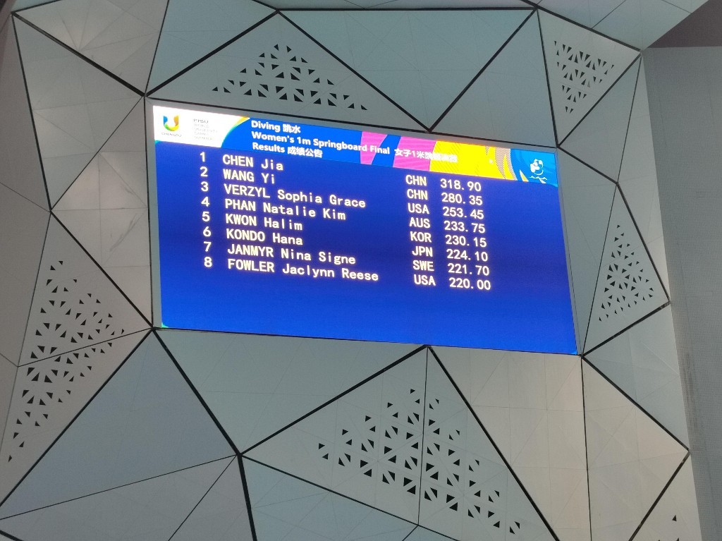 今天下午女子跳水1米板决赛正式开始,经过5轮角逐,中国运动员陈佳、王壹凭借出色表现让中国队包揽了本项目的金牌和银牌,其中,陈佳以318.90分获得金牌,王壹以280.35分获得银牌。