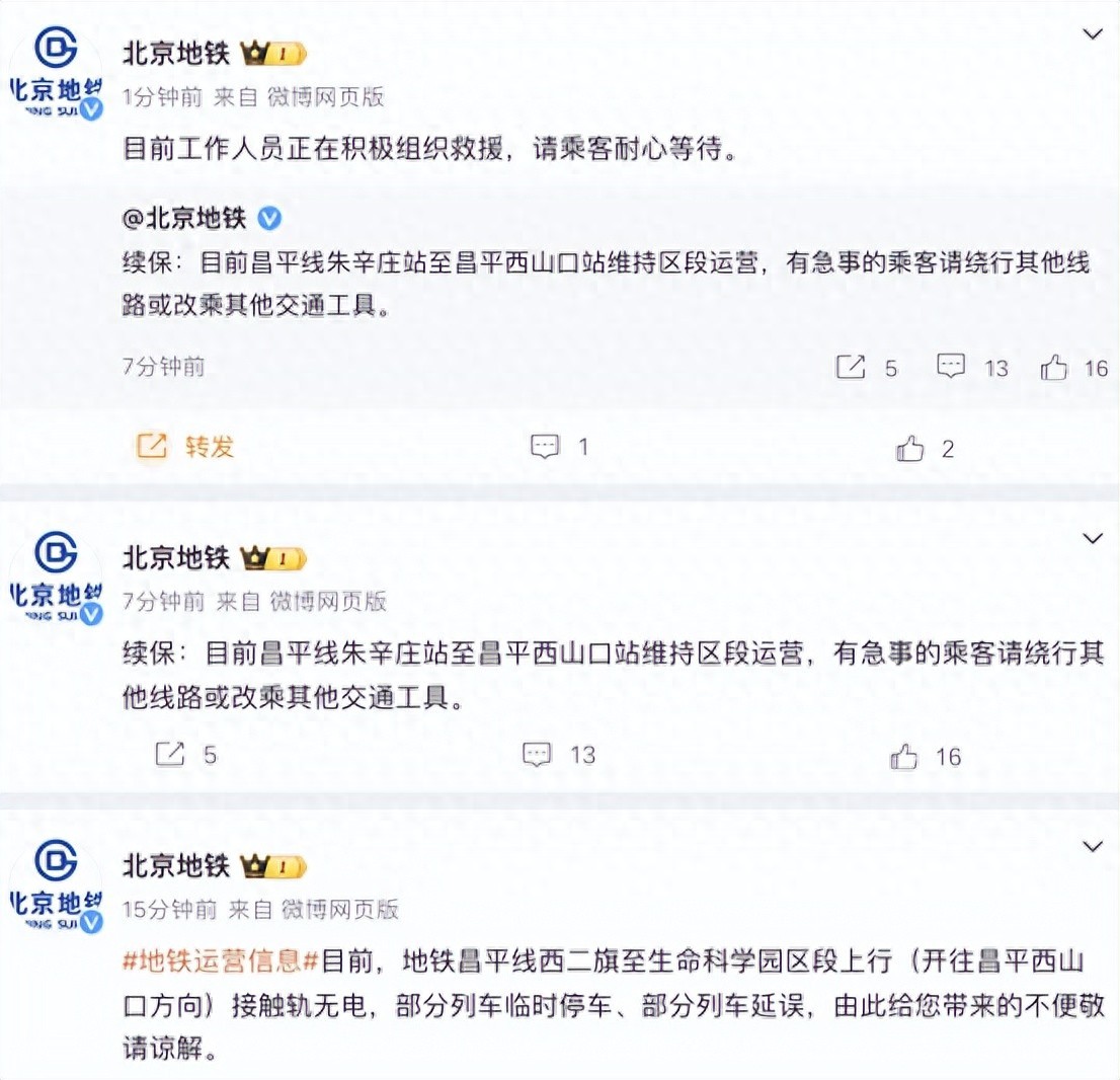 北京地铁:目前工作人员正在积极组织救援,昌平线朱辛庄站至昌平西山口站维持