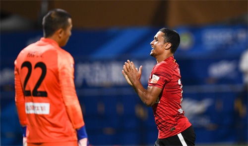 6月24日,长春亚泰队球员埃里克(右)进球后庆祝。 新华社记者 杨冠宇 摄