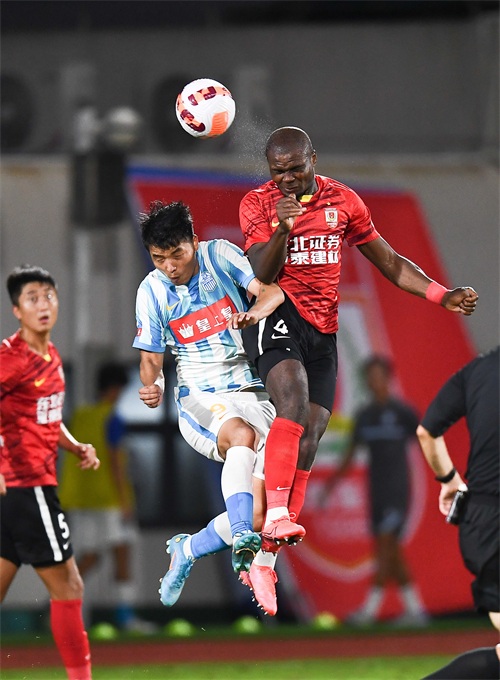 6月24日,长春亚泰队球员奥克雷(右)与广州城队球员桂宏在比赛中争顶。 新华社记者 杨冠宇 摄
