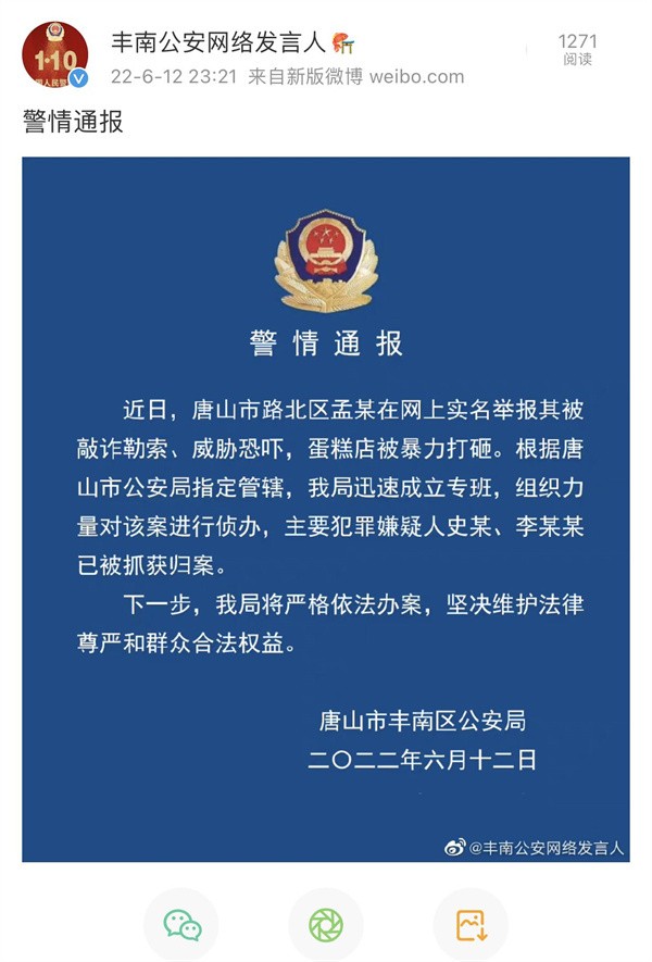 丰南公安网络发言人官方微博截图