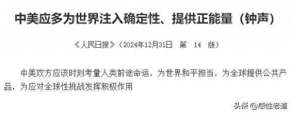 尽管美国人的定义是竞争关系,但这种竞争不是你死我活的关系,这也不符中国的国家利益和中国的大国相处之道。未来,中美关系的发展,中国智慧,中国力量的参与是可预期的,因为中国愿与全世界的国家交朋友,世界好中国才会好,中国好世界会更好。毕竟中国人民和美国人民曾经有过携手并进对抗法西斯势力的光荣行为。而美国人民为了帮助中国人民也曾经付出了很多这些事件,我们都铭记在心。我们也希望美国政府带领美国人民和中国政府带领的中国人民能够携手,并进这个世界这么大容得下所有国家同台竞技。