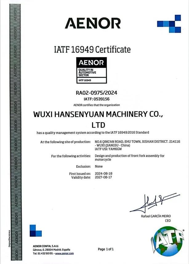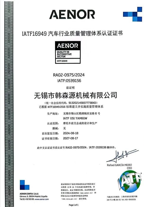 继签约国家“985”“211”双一流高校华南理工大学,就两轮车可调阻尼减震器研发等方面达成深度合作后,韩森减震再度传来重磅消息:成功通过权威机构的层层严苛审核,荣获IATF16949汽车行业质量管理体系认证证书,足见韩森突破自我革新求变、打造更高水准减震器产品的实力和决心。