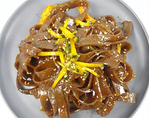 黑擀面皮,跟白擀面皮比起来,样子黑乎乎的,外地人看了不敢吃,实际上黑擀面皮的营养又比白擀面皮还要丰富,工序有七八种,主要是添加了酱油,使得其颜色变成深褐色,黑擀面皮可以炒,也可以凉拌,也可以跟白擀面皮搭配在一起吃,是陕西独有的特色小吃,其他地方吃不到!