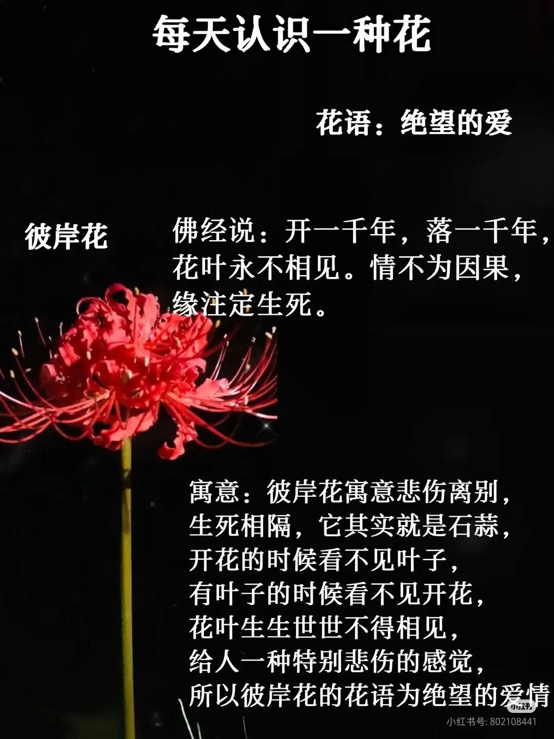 彼岸花,为石蒜科石蒜属多年生草本植物,又称曼珠沙华、石蒜、老鸦蒜、龙爪花、蟑螂花、两生花、幽灵花、舍子花。具有卵球形地下鳞茎,像一颗大蒜。花色红,形如龙爪;具鳞茎,形如洋葱头;叶丛生,细长尖端,状似蒜叶,肉质、带形、青绿色具白粉;花萼单生,顶生伞形花序。花期9 - 10月。