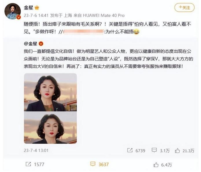 或是嫌吐槽不够吸引关注,金星干脆直接用社交账号发文吐槽,指责女星捂胸口属于没自信,既然穿了深V就应该大方展示出来,还表示真正有实力的演员不需要靠夸张的服饰博取眼球。