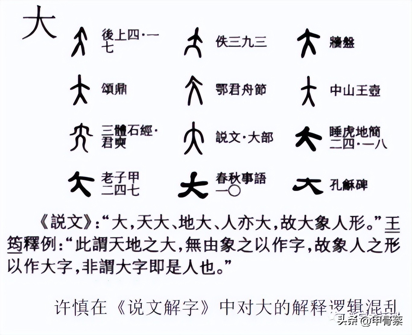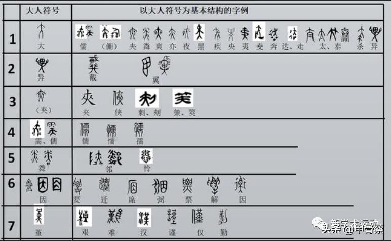 因此,甲骨文根本上来说,是“文以载道”的义理文字、“象义”文字。这些看法都是我研究甲骨文的独创性的体会和收获,在其他地方看不到,所以很难理解。下面我就以貌似很简单的甲骨文“大”,以及以大为结构的其他甲骨文字例来说明这一点。