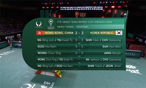 第1局,韩国组合申裕斌/田志希3-1取得领先,中国香港队请求了暂停,暂停回来,中国香港组合杜凯琹/吴咏琳追回1分,之后韩国组合逐渐主导了比赛,最终韩国组合11-4拿下,帮助韩国队大比分8-5战胜中国香港队,晋级决赛,将与国乒队伍争冠!