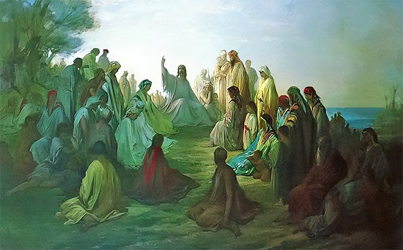 当然,这也只是传说,或者说是一种象征。没有人知道耶稣在沙漠里到底思考了什么。但是从那之后,他的内心世界就有了一次巨大变化,就好像经历了一次精神大爆炸一样。有一天,耶稣忽然站到了山顶上,向大家开始演讲。这段演讲就是著名的登山宝训,在历史上非常的有名。