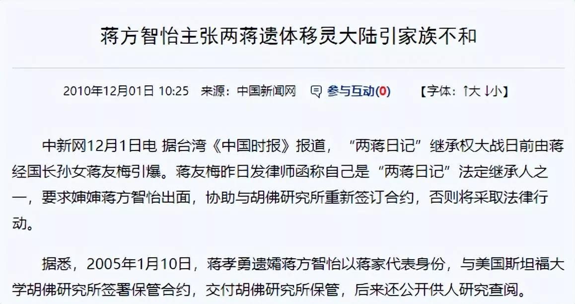 2010年12月01日 10:25 来源:中国新闻网,蒋方智怡主张两蒋遗体移灵大陆引家族不和