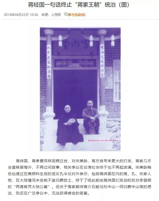 蒋瑶光的孩子,销声匿迹,没有涉及政坛,对于蒋介石魂归故土的遗愿一概不知。