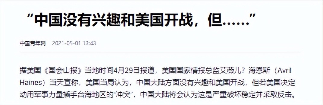 美国国家情报总监艾薇儿·海恩斯宣称,若美国决定动用军事力量插手台海地区的“冲突”,中国大陆将会认为这是严重破坏稳定并采取反击。