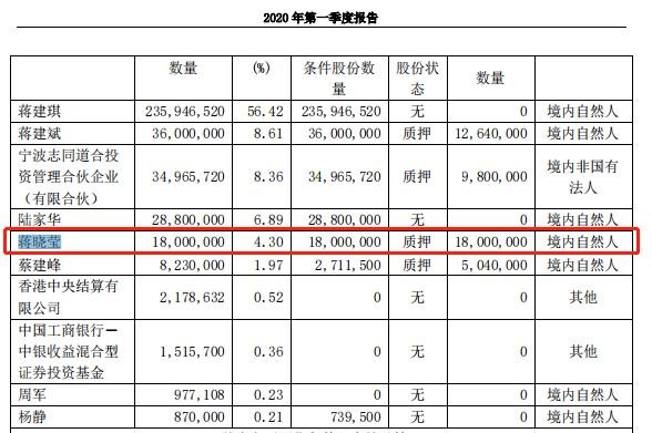 根据2020年一季度报内容,蒋晓莹持有公司1800万股股票,占总股本的4.3%。