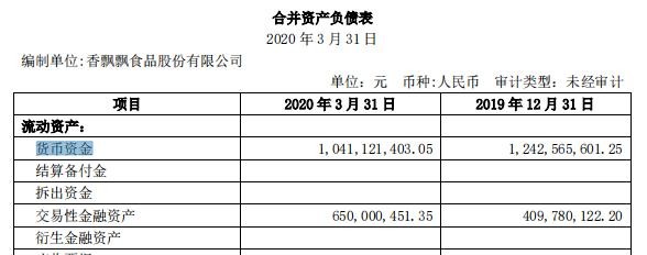 截至2020年一季度末,香飘飘账面上的货币资金为10.41亿元,交易性金融资产为6.5亿元,两项资产合计为16.91亿元,占总资产的41.36%。