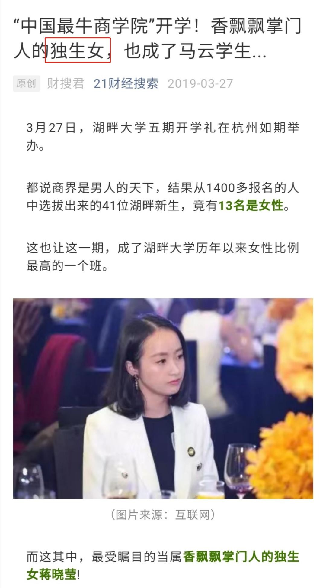 而90后的蒋晓莹和诸多富二代一样,自小接受优渥的教育,大学毕业于浙江大学,还曾踏进湖畔大学,成为这所著名商学院里的一员、马云门徒。