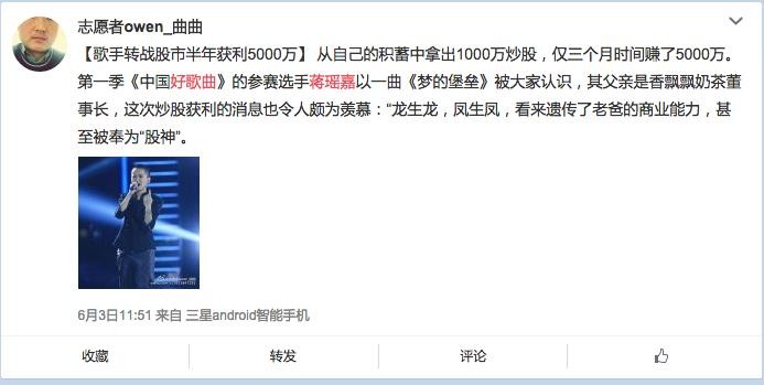 歌手变“股神”,跨度也太大了,莫非是遗传了老爸蒋建琪的商业大鳄天赋?