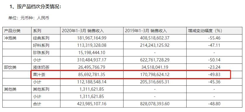 被寄予厚望的果汁差质量堪忧,在消费者中的口碑越来越差。今年一季度,果汁茶销量相比去年同期暴跌49.83%。
