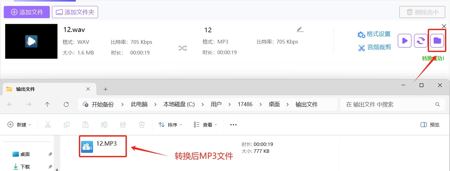 步骤4:软件的转换速度非常快,当其完成转换后大家只需点击文件右侧的文件夹图标就可以将软件的输出目录打开,打开后就可以找到其中转换好的MP3文件。