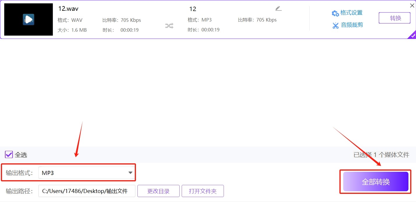 步骤3:wav文件添加完成后,请大家将左下角的输出格式设置为MP3,设置完成后点击右下角的全部转换按钮就可以启动wav转MP3程序。