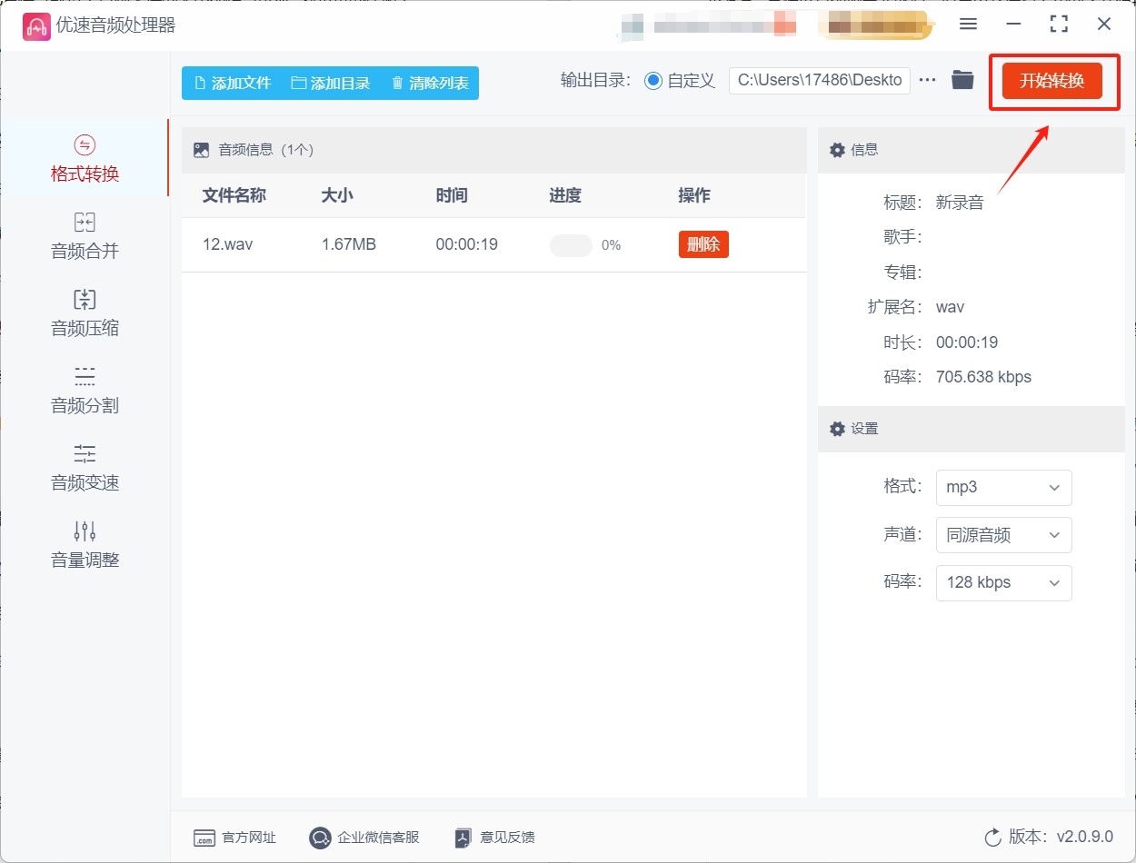 步骤4:各种设置都调整完成后,请点击软件右上角的【开始转换】按钮,点击这个按钮就可以启动wav转MP3程序。