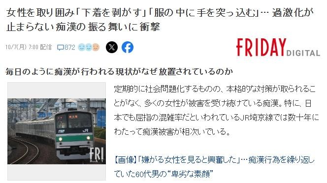 东京市内到埼玉的JR埼京线,就是重灾区之一,素有“痴汉电车”之称,是日本痴汉犯罪率最高的铁路线。