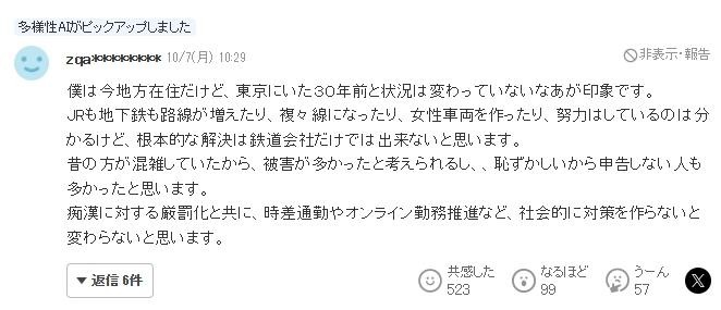 我现在住在地方感觉和30年前一样没有改变。我知道JR和地铁都在努力增加线路、修建复线、制造女性车厢,但我认为仅靠铁路公司是无法解决根本问题的。以前的拥挤程度更高,因此可以认为受害者更多,而且因为害羞而不报案的人也很多。在严惩色狼的同时,我认为如果不在社会上制定对策,比如时差通勤和推进在线工作等,情况就不会改变。