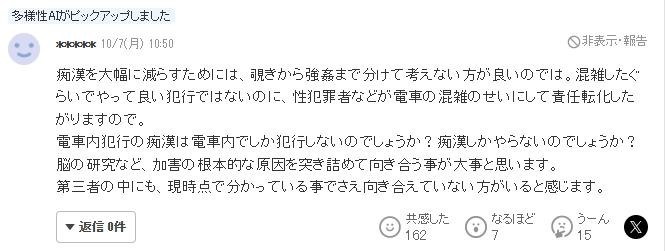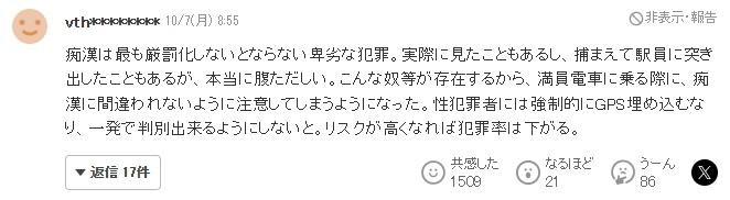 痴汉是最需要严惩的卑劣犯罪。我实际上见过这样的事情,也曾抓住过痴汉并把他交给了车站工作人员,真是令人愤怒。正因为有这样的家伙存在,我在乘坐拥挤的电车时,变得更加小心,以免被误认为是痴汉。对性犯罪者应该强制植入GPS,或者采取其他措施以便一眼就能识别出来。如果风险增加,犯罪率就会下降。