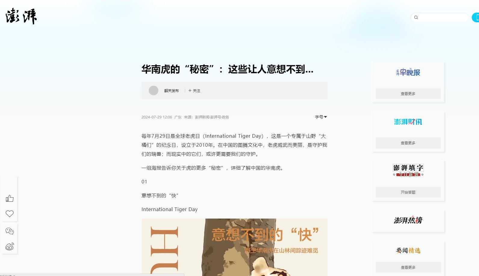 1970年代末,在福建省武夷山地区出现了,最后一次可靠的野生华南虎目击记录。