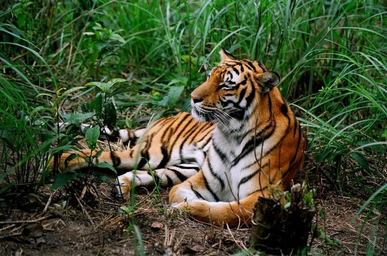 橙黄色的皮毛上,布满黑色条纹,腹部和内侧则是纯白色,整体看起来既威武又优雅。